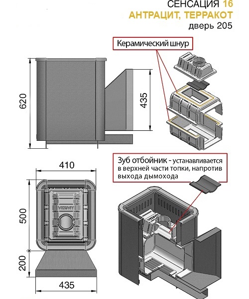 Топка чугунной печи «Сенсация» состоит из трёх элементов, толщиной не менее 12 мм. На стыке между ними используется керамический шнур с рабочей температурой 1200 градусов. То есть топка печи абсолютно герметична! Для фиксации деталей между собой применяется болтовое соединение, что даёт 100% гарантию безопасности при эксплуатации. Печи отлиты из специального сплава чугуна, которые выдерживают максимальные температурные перепады, т.е. даже при попадании большого количества воды чугунная печь сохраняет свою исключительную целостность и не лопается в отличие от изделий других производителей.