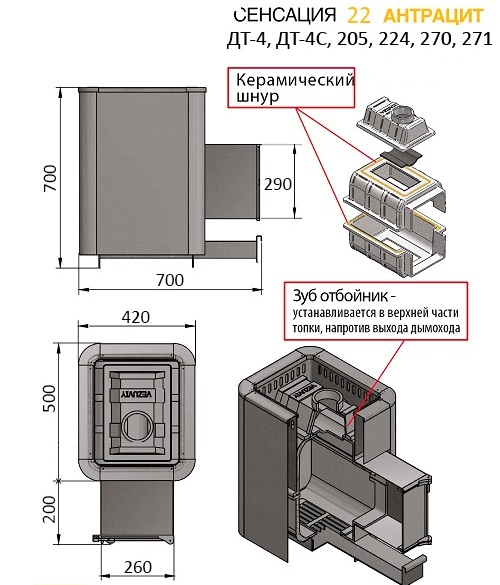 Преимущество печи в том, что топка печи состоит из 3-х элементов. На стыке между ними используется керамический шнур с рабочей температурой 1200 градусов. То есть топка печи абсолютно герметична! Для фиксации деталей между собой применяется болтовое соединение, что даёт 100% гарантию безопасности при эксплуатации.