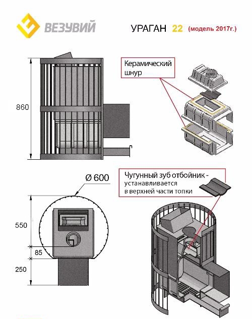Преимущество печи в том, что она состоит из 3-х элементов. На стыке между ними используется керамический шнур с рабочей температурой 1200 градусов. То есть топка печи абсолютно герметична! Для фиксации деталей между собой применяется болтовое соединение, что даёт 100% гарантию безопасности при эксплуатации.